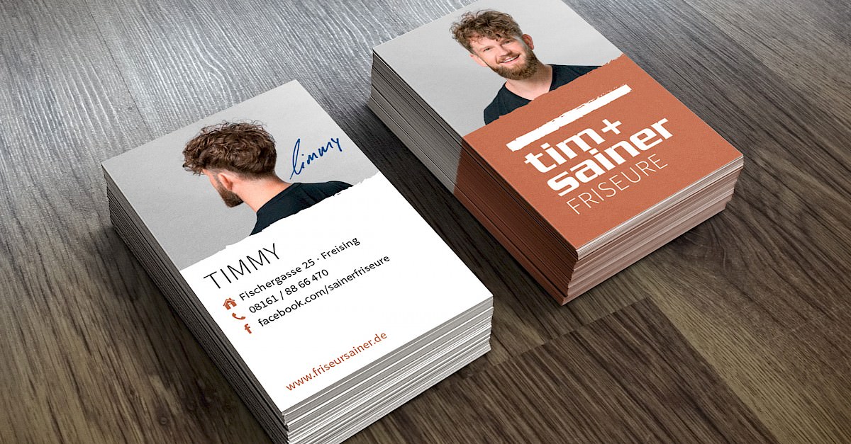 Bei Sainer Friseure und dessen Geschwister-Laden Tim+Sainer Friseure dreht sich alles ums Haar. Da liegt es nahe, dass man das Team auf den Visitenkarten auch gleich mit schnieke gestylter Frisur abbildet. Natürlich im 360° Modus. Da ein paar Löckchen, hier ein Vollbart, dort ein paar Highlights. Sainers Kunden können sich so auch gleich Inspiration für Ihren nächsten Haarschnitt holen und sich das sympatische Gesicht von den Visitenkarten raussuchen, bei denen jeder Mitarbeiter eine eigene mit Unterschrift bekommen hat. So kann man den Verwöhn-Besuch beim Friseur gleich noch mehr genießen, während man auf einem von Sainers Figaro-Stühlen trohnt.