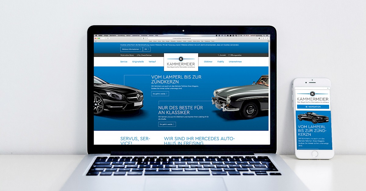 Das hiesige Mercedes-Autohaus Kammermeier ist eine Freisinger Institution. Trotzdem - oder gerade deswegen - bekam der Spezialist für die Automobile mit dem Stern ein eigenes neues Corporate Design verpasst - mitsamt neuem Webauftritt, neuen Visitenkarten sowie Beachflags für die Bewerbung im Autohaus sowie auf Events. Die Neukonzeption sowie Betextung erfolgte in Zusammenarbeit mit unserer Partneragentur Kasper Communications, ebenfalls aus Freising.