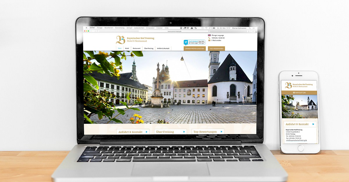 Der Bayerische Hof Freising ist das Hotel am Platze – und benötigte deshalb Anfang 2017 auch einen entsprechenden Webauftritt. Mit modernerem Design und v.a. einer mobil optimierten Programmierung. Nicht umsonst werden heutzutage vielen Hotel-Recherchen und auch Buchungen direkt vom Smartphone erledigt...
